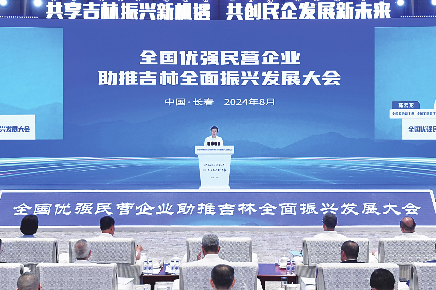 【本報訊】8月12日,全國工商聯(lián)十三屆三次常委會議在長春召開期間,吉林省人民政府、全國工商聯(lián)共同主辦的“共享吉林振興新機遇、共創(chuàng)民企發(fā)展新未來”全國優(yōu)強民營企業(yè)助推吉林全面振興發(fā)展大會同步舉行。全國政協(xié)副主席、全國工商聯(lián)主席高云龍出席會議并講話。吉林省委副書記、省長胡玉亭講話。中央統(tǒng)戰(zhàn)部副部長、全國工商聯(lián)黨組書記沈瑩出席。吉林省副省長李國強主持大會。